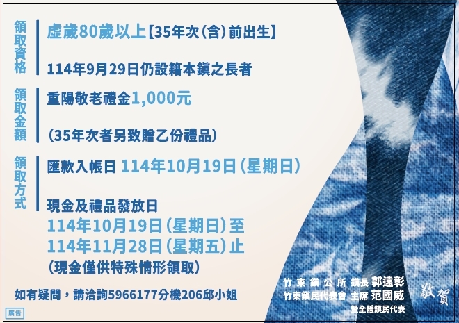 竹縣竹東鎮80歲以上重陽敬老禮金1000元 10/19匯款入帳