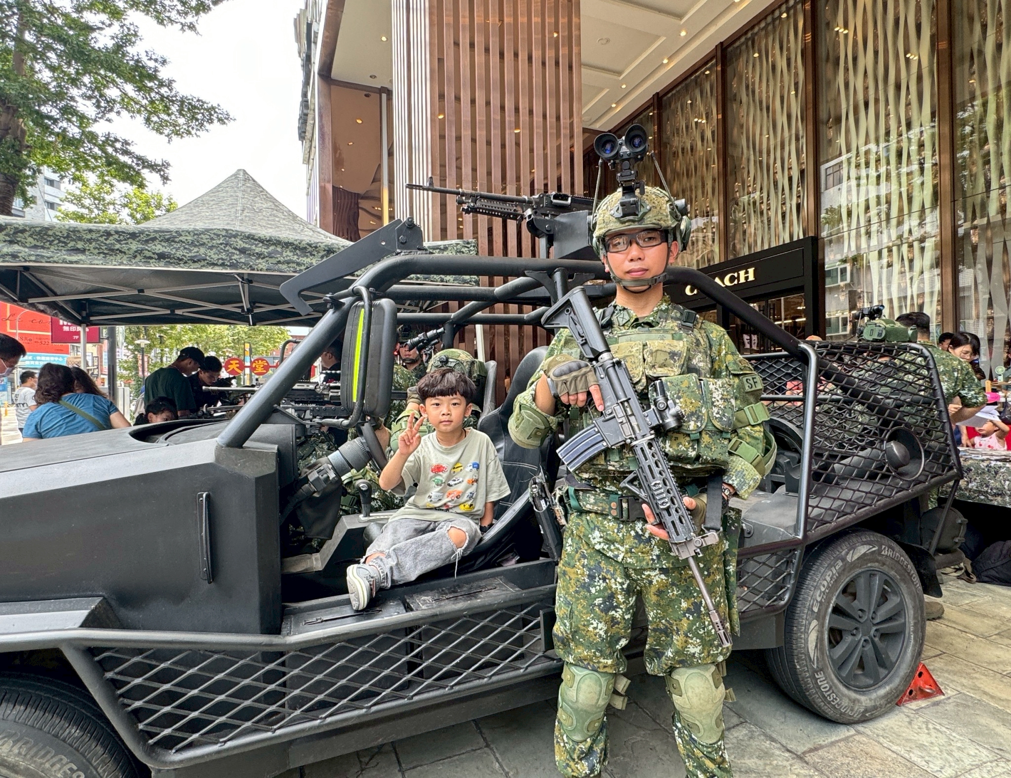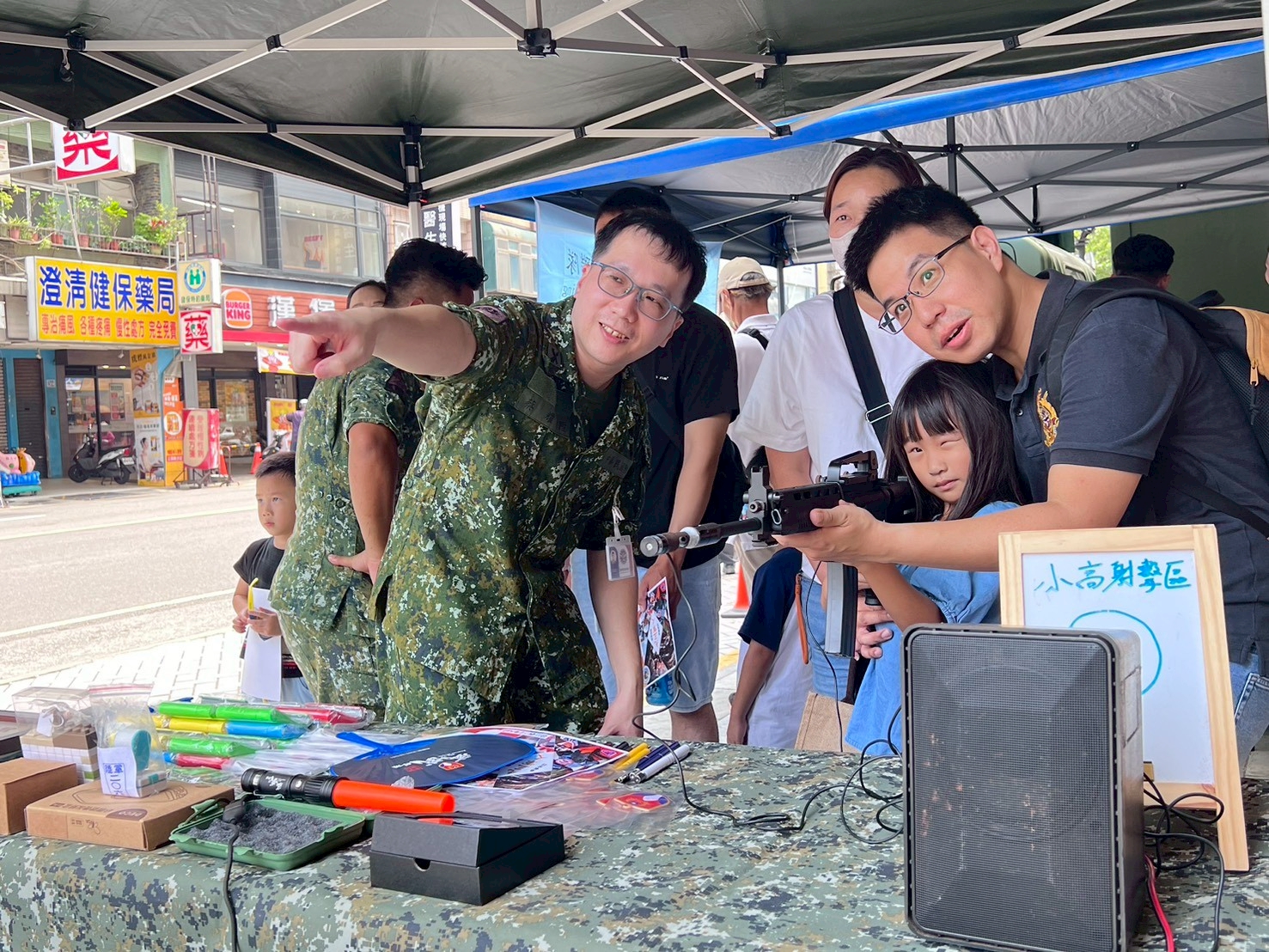 活動一開始,由陸軍裝甲第 584 旅帶來震撼人心的戰鼓表演,磅礡鼓聲震撼全場,為活動揭開序幕。現場更集結多項軍事裝備首次亮相,包括空軍氣象聯隊的車載式剖風儀車、重型拖式悍馬車、戰術型無人機、特戰突擊車以及憲兵警備車,讓民眾近距離一睹國軍的精良裝備,吸引不少大小朋友駐足拍照。