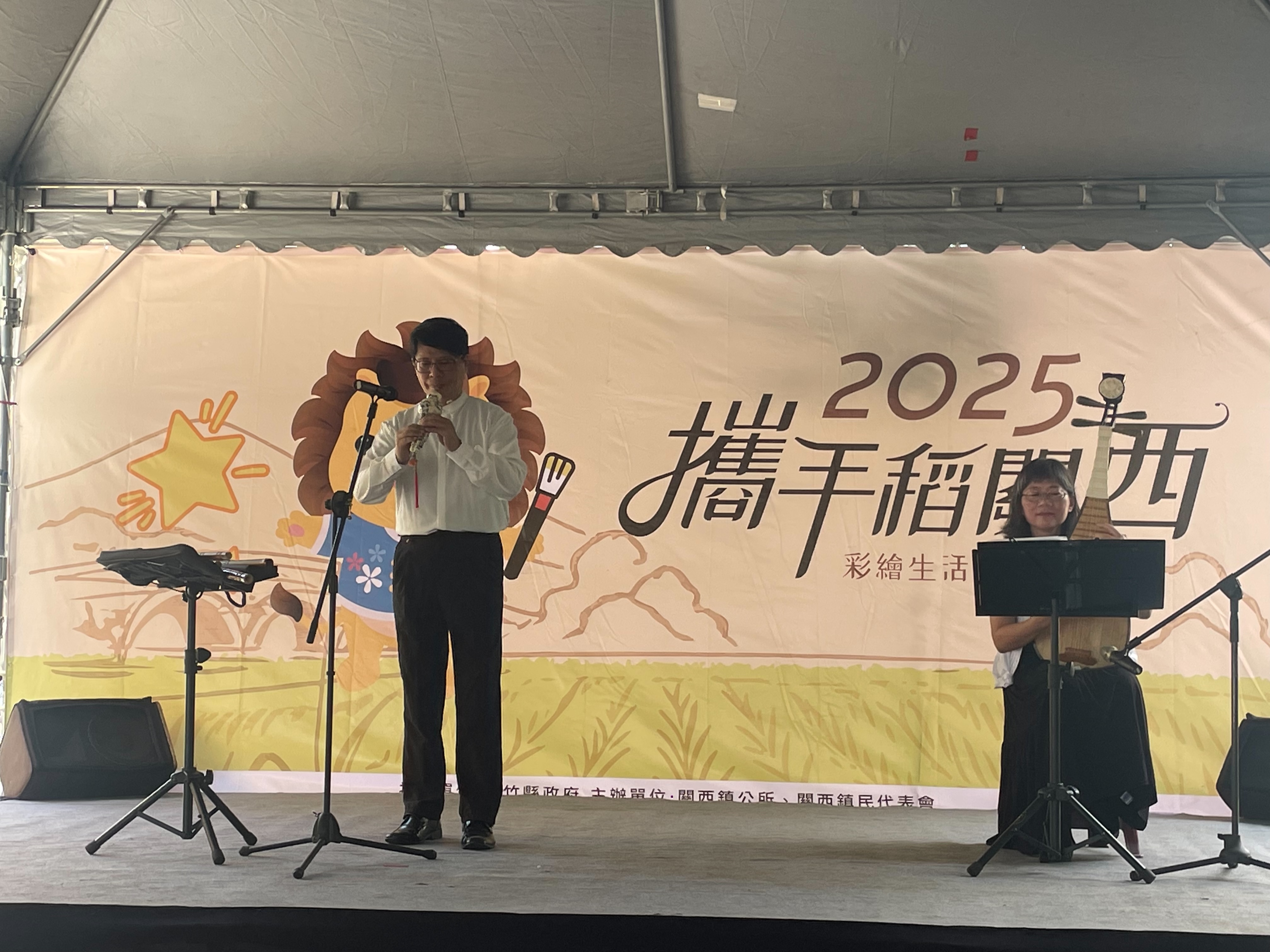 攜手稻關西周六首日登場,新竹縣民俗樂團陳老師在現場演奏雲南傳統樂器葫蘆絲,本身會六十多種樂器的陳老師,在現場民眾要求下,臨時加碼吹奏鄧麗君的甜蜜蜜,讓現場民眾大飽耳福。陳老師也預告十一月八日,竹縣民俗樂團將在關西高中演出民歌,喜愛民歌的民眾千萬別錯過。