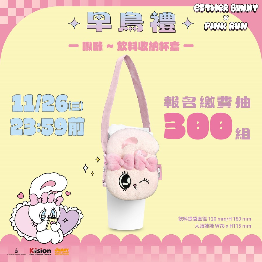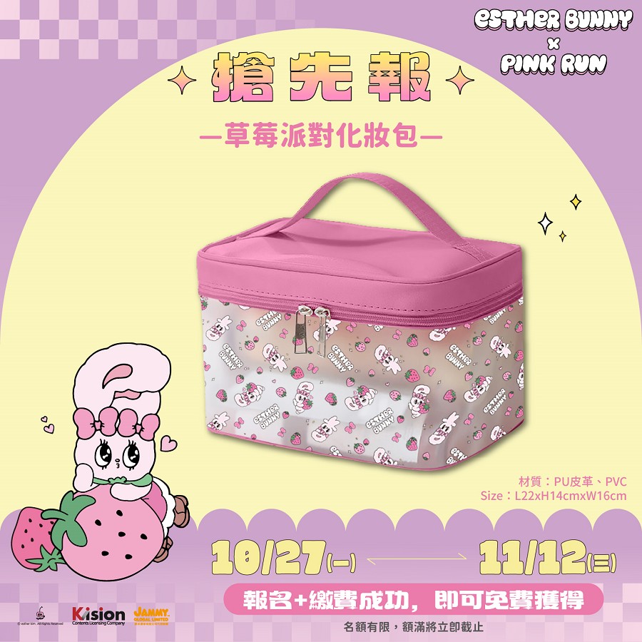 10/27 起至 11/12 止搶先報名,並完成繳費者,即可免費獲得「草莓派對化妝包」乙個,粉嫩透明款搭配角色造型,實用又好拍。11/26 前完成早鳥報名,更可參加限量抽獎活動,有機會獲得「啾咪~飲料收納杯套」乙份,共限量 300 組,角色控與收納控都不能錯過的超萌週邊,讓日常也能角色感滿滿。