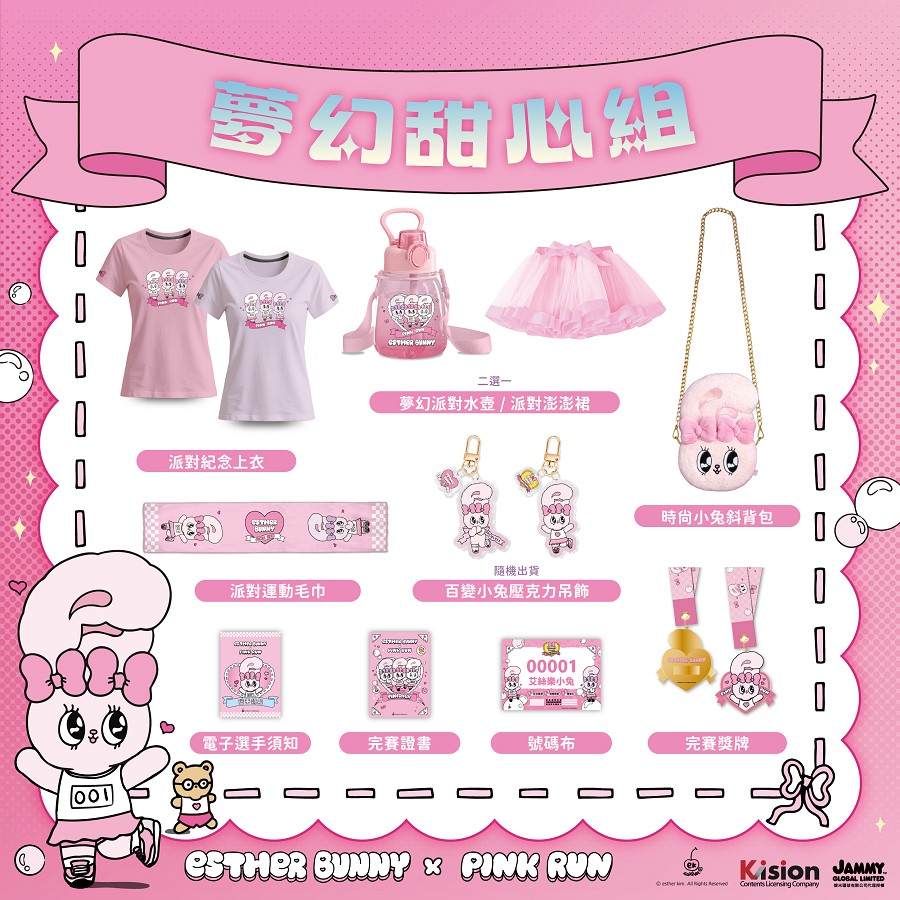 全統運動指出,參賽者報名即獲得「路跑限定」物資組合,內容包括派對紀念上衣、時尚小兔斜背包、夢幻派對水壺/派對澎澎(二擇一)與限定款完賽獎牌,讓每位跑者都能把最萌回憶收藏回家。