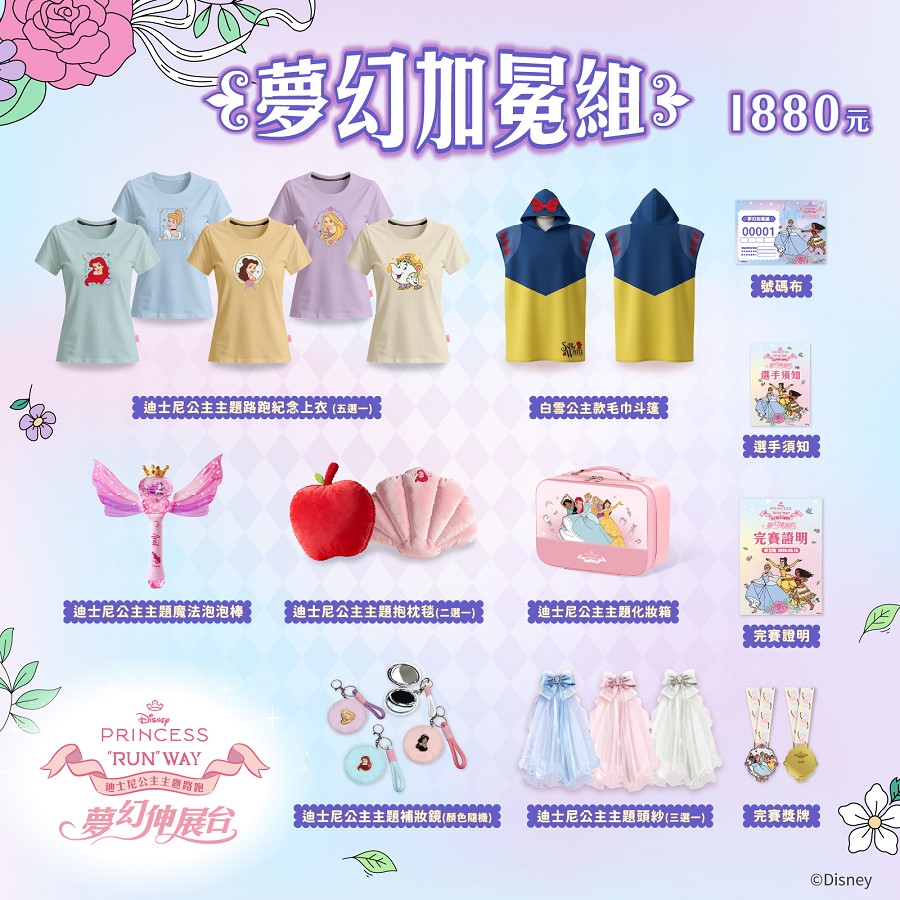 參加者可依喜好選擇「閃耀變身組」或「夢幻加冕組」報名,所有組別皆含迪士尼公主主題路跑限定物資與完賽證明、獎牌。閃耀變身組含:公主頭紗、化妝箱、毛毯、泡泡棒與補妝鏡;夢幻加冕組則有白雪公主斗篷、抱枕毯與完整進階物資,讓你從起跑到終點,全程夢幻、信心滿滿!