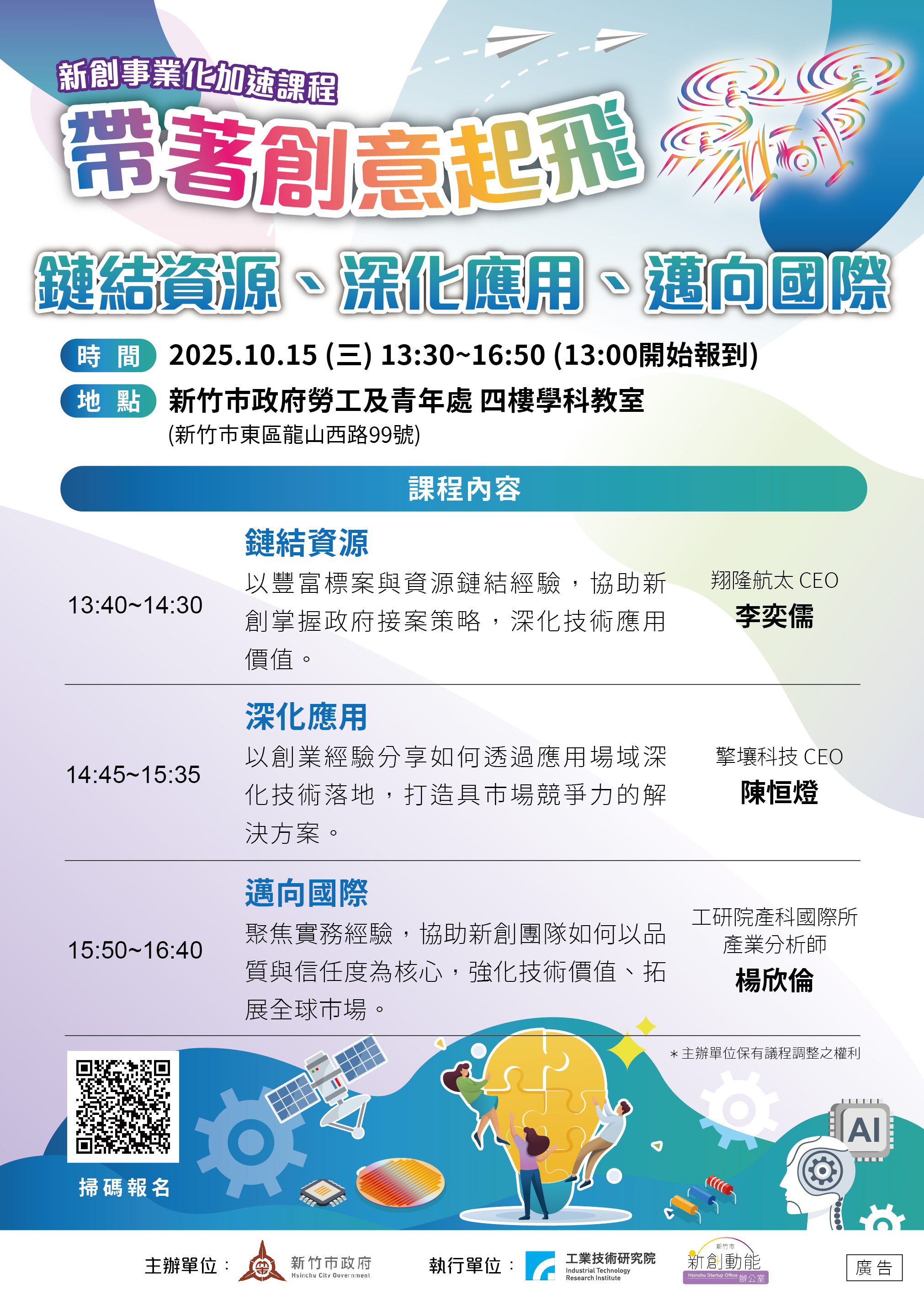 為協助新創團隊強化事業化能力與國際競爭力,新竹市新創動能辦公室將於10月15日下午13時至17時在新竹市政府勞工及青年處,舉辦「帶著創意起飛:鏈結資源、深化應用、邁向國際」講座。活動將邀請三位具豐富創業與產業實戰經驗的講師,與民眾分享從公部門專案接軌、應用深化到國際市場拓展的關鍵策略,協助新創企業從創意發想到落地實踐,打造永續成長的創業藍圖。